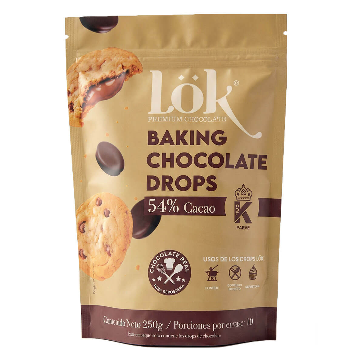 Descubre las Gotas de Chocolate Premium Lök, elaboradas con un 54% de cacao real, diseñadas especialmente para elevar tus creaciones de repostería. Estas gotas de chocolate auténtico son perfectas para hornear deliciosas galletas, pasteles y postres, aportando un sabor intenso y una textura irresistible. Su versatilidad las hace ideales también para fundir en un fondue o para disfrutar directamente como un snack gourmet. Este producto cuenta con certificación Kosher Parve. Presentación en bolsa de 250g.