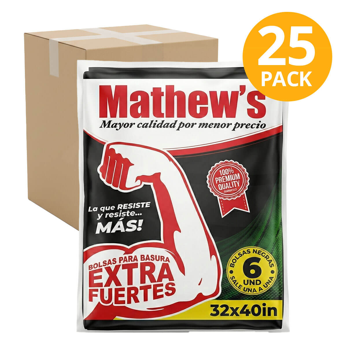 Más capacidad, misma resistencia. Bolsas Mathew’s grandes 32×40 in (33 GAL), extra fuertes y negras — perfectas para contenedores y uso comercial. Caja cerrada: 25 paquetes de 6 bolsas = 150 bolsas en total. La que resiste y resiste más. Extra strong black trash bags.