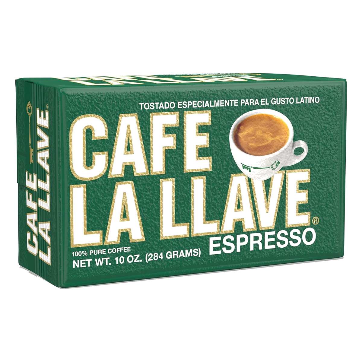 Café espresso 100% puro, tostado especialmente para el gusto latino. Peso neto 284 gr (10 oz). La Llave Espresso Pure Coffee.