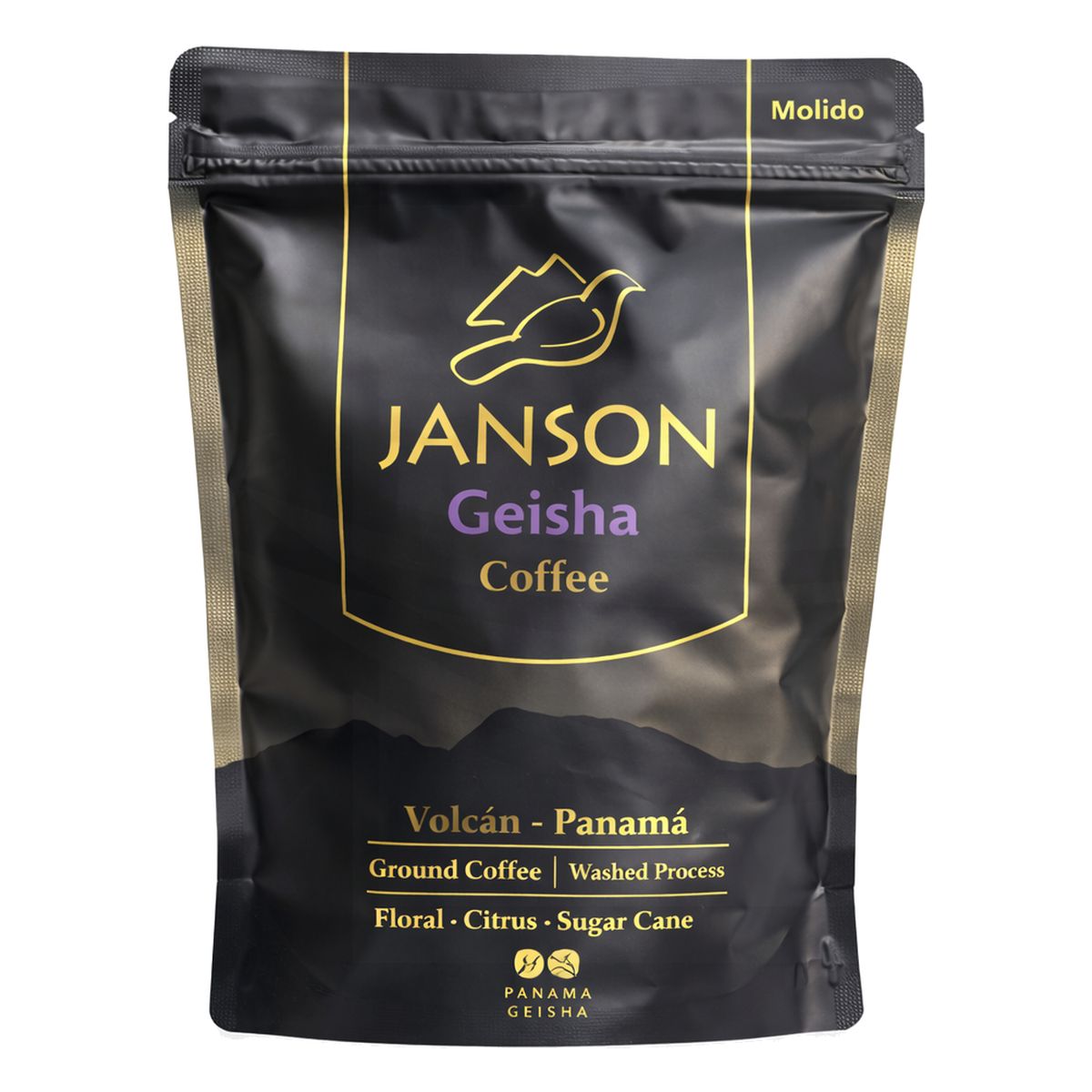 Café de especialidad 100% arábica variedad Geisha, cultivado en Volcán, Panamá. Proceso lavado. Notas florales, cítricas y caña de azúcar. (Janson Geisha Washed Ground Coffee)