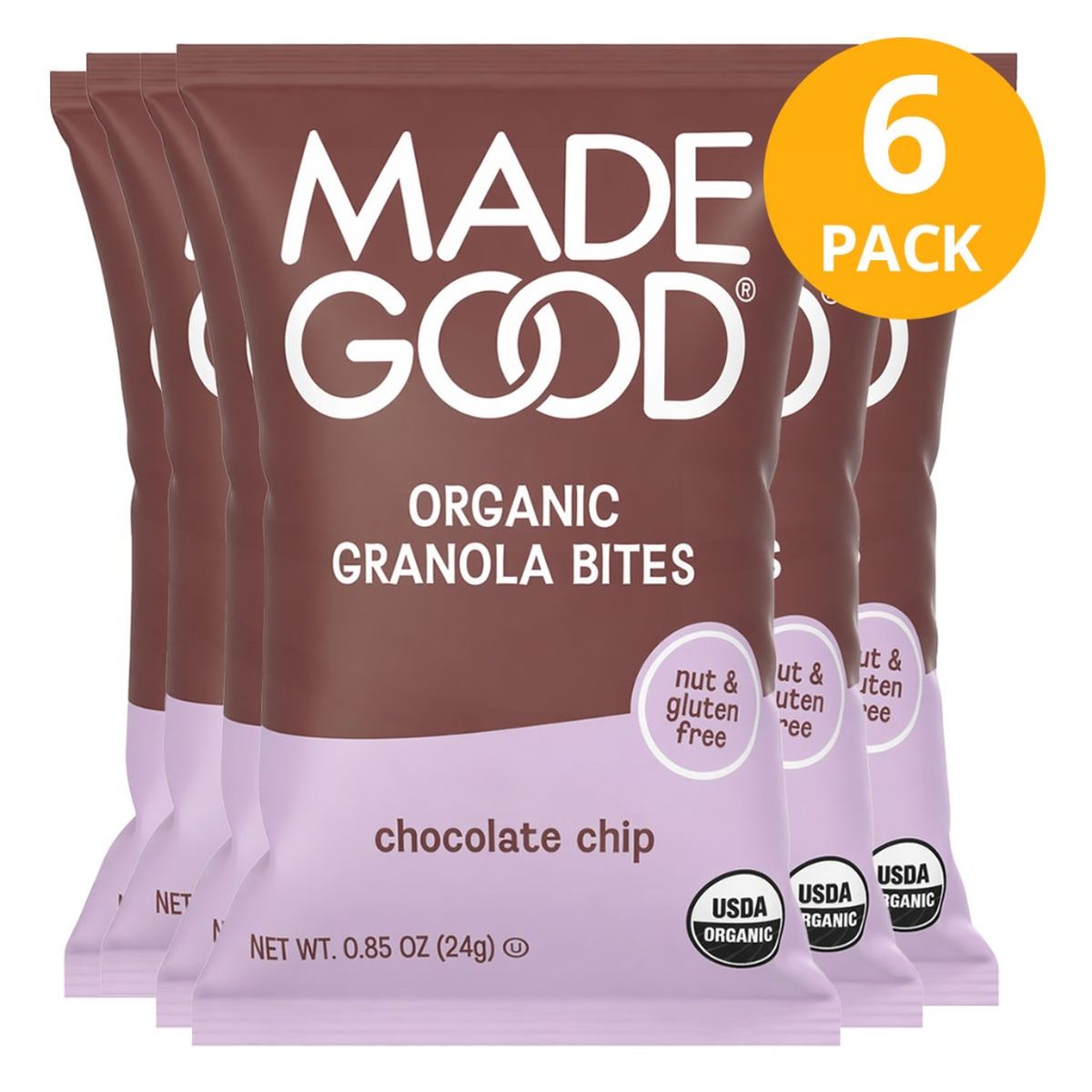Made Good Granola Organic Mini Chocolate Chip. Mini bocados de granola orgánica certificada con trozos de chocolate. Libres de gluten y libres de los principales alérgenos (sin nueces, sin lácteos, sin soya, sin huevo). Endulzados con jarabe de caña orgánico. Pack de 6 bolsas individuales de 0.85 oz (24 g) cada una. Producto kosher. Hecho en Canadá.