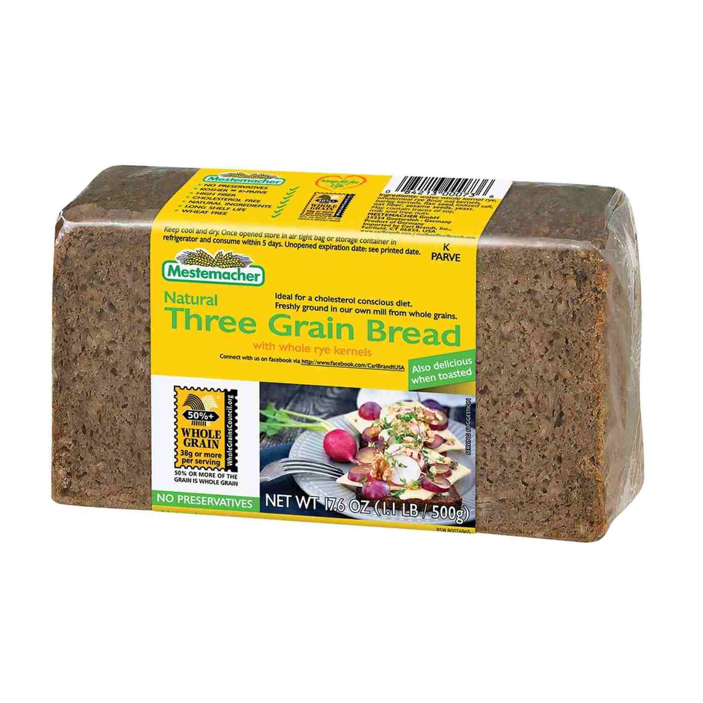 Natural Three Grain Bread with whole rye kernels. Pan alemán de tres granos con centeno integral. 50%+ Whole Grain (38g or more per serving), sin preservantes. Ideal para una dieta consciente del colesterol. También delicioso tostado. Ingredientes: water, whole kernel rye, wholemeal rye flour, oat kernels, barley kernels, flax seed, iodized salt, oat fiber, sesame seeds, yeast. May contain traces of soy and tree nuts. Producto de Alemania. Kosher PARVE.
