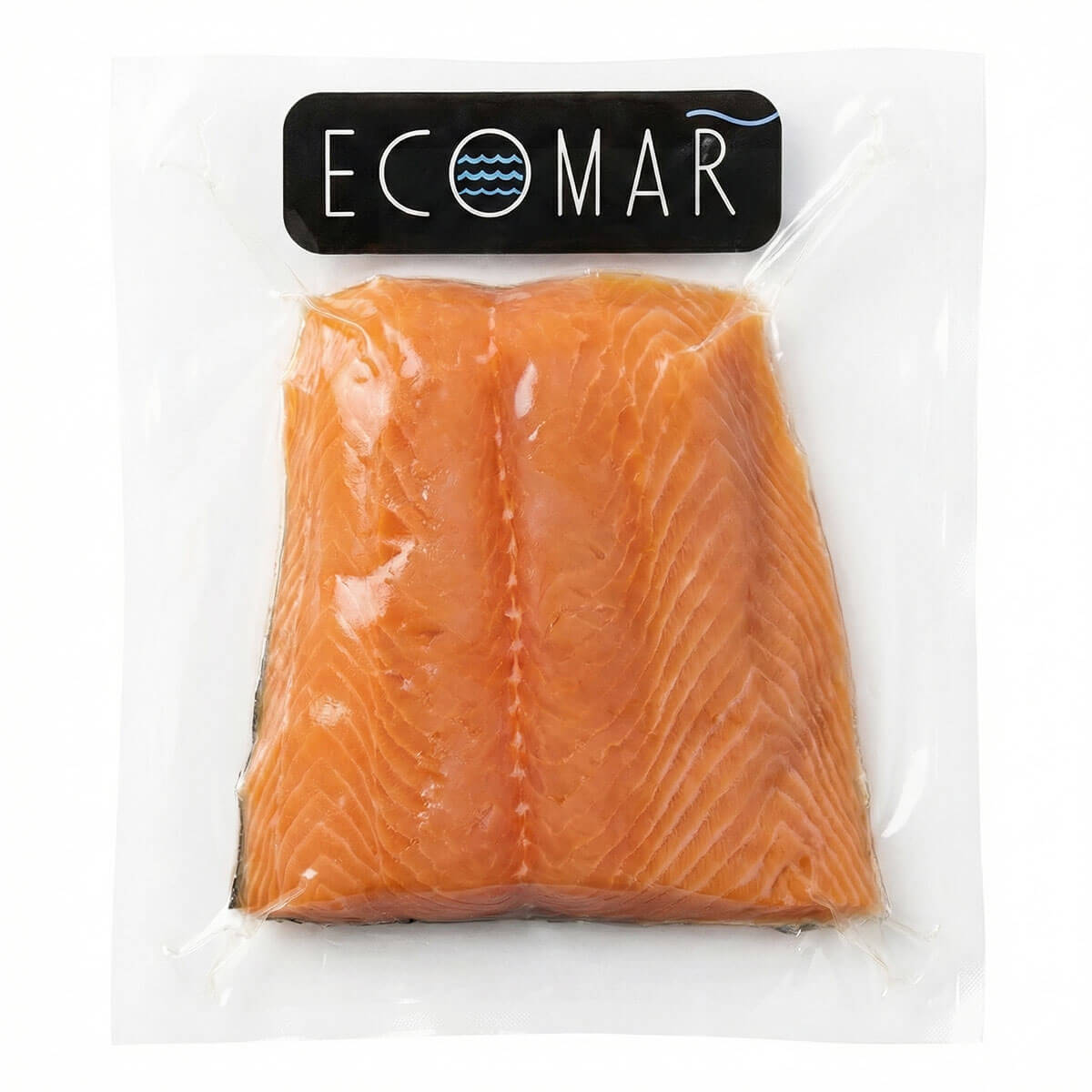 Cola de salmón congelada con piel, ideal para hornear o preparar a la parrilla. Peso neto 198 gr (7 oz). Frozen salmon tail with skin.